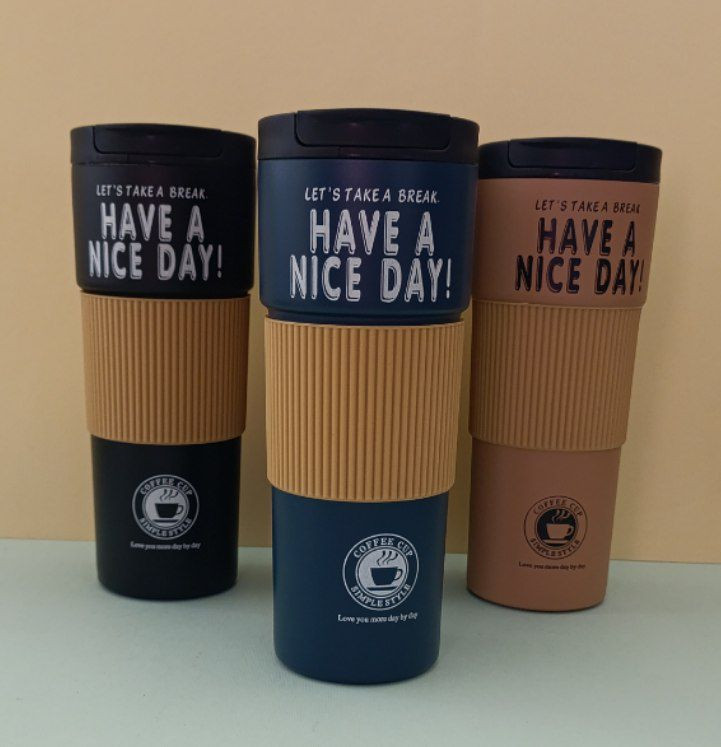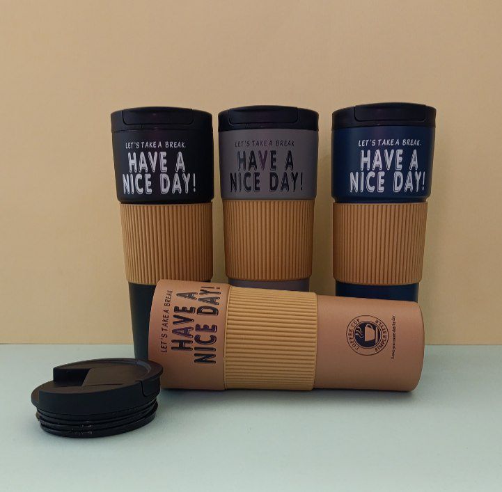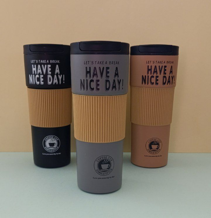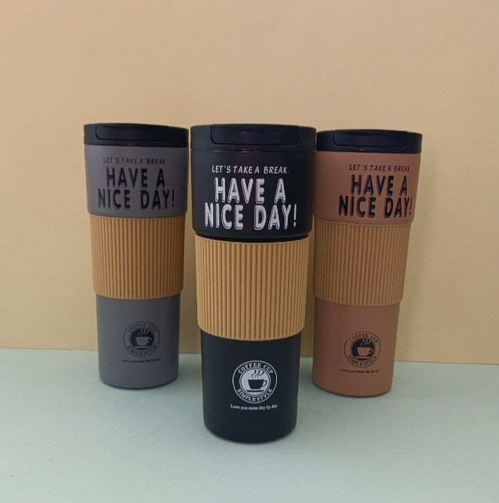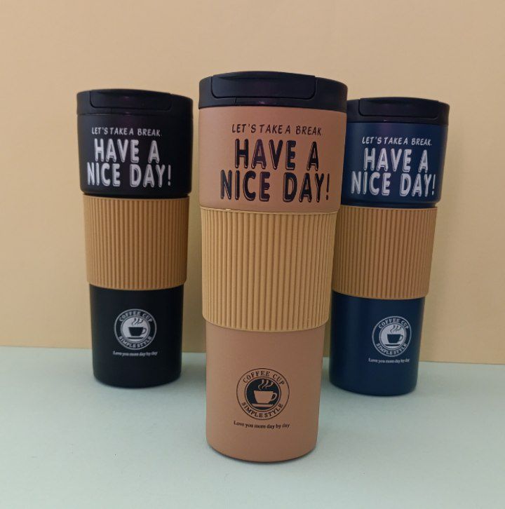 تراول ماگ ۶۰۰ میل دورسیلیکونی مدل HAVE A NICE DAY – ماگ استیل 316 دوجداره با درب پیچی و دهانه آساننوش، روکش سیلیکونی ضدلغزش