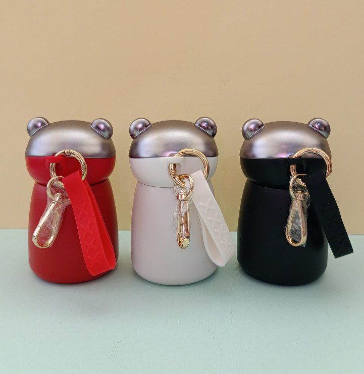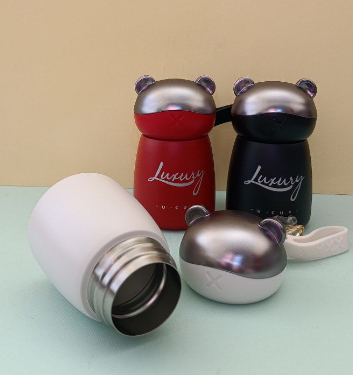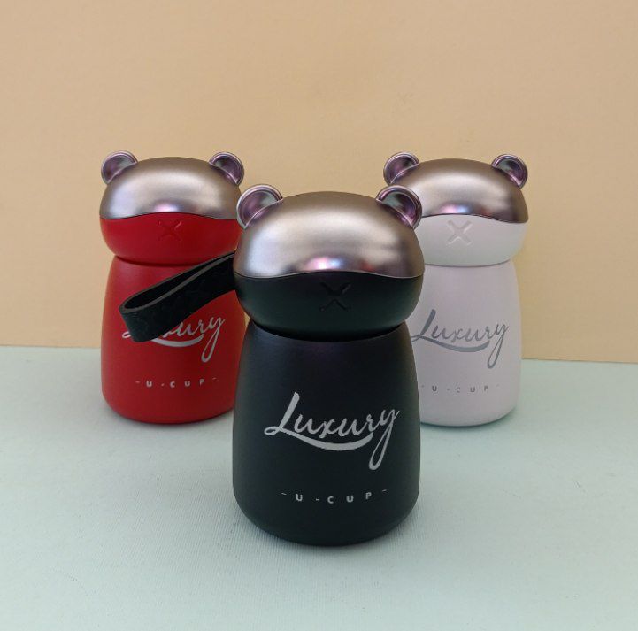 تراول ماگ خرسی نقلی 120 میل مدل U-CUP – ماگ اسپرسو استیل 304 دوجداره با درب پیچی طرح خرس تدی، بند سیلیکونی همرنگ و گیره طلایی جاسویچی