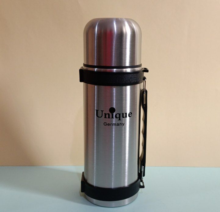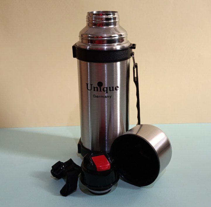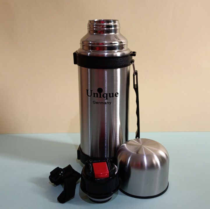 فلاسک unique استیل دوجداره یونیک ۱۲۰۰ میل | درب فنجانی، دکمهدار فشاری، بند دوشی و حفظ دمای طولانی